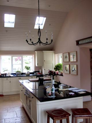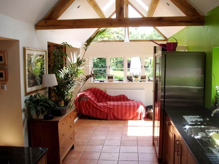 One of the principal issues was the detail required for the existing chimney to be retained, the AGA to be located within the new room yet retain the use of the flue. In addition the, long range, views were to be exploited and the large opening screen allowed the room to be extended into the garden.